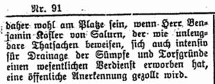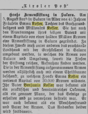 Die „Tiroler Stimmen“ heben am 11. Juni 1908 „verdiente Salurner“ hervor. Darin wird Benjamin Kofler genannt, der am 18. Jänner 1833 in Salurn geboren wurde, dortselbst Apotheker und Großgrundbesitzer war und am 22. Dezember 1905 verstarb.
