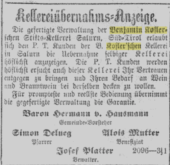 Die Kellerei Kofler ging 1906 an Baron Hausmann über: