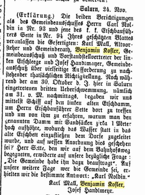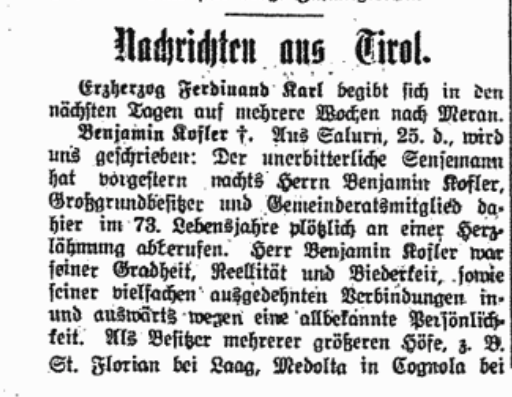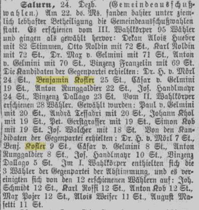 Benjamin Kofler war aber auch Gemeinderatsmitglied. Die „Neuen Tiroler Stimmen“ ordnen Kofler als Angehörigen der „Gegenpartei“ zu den Klerikalen ein. Er war also ein Freiheitlicher. Der Artikel betrifft die Gemeindeausschusswahl am 29. Dezember 1890: